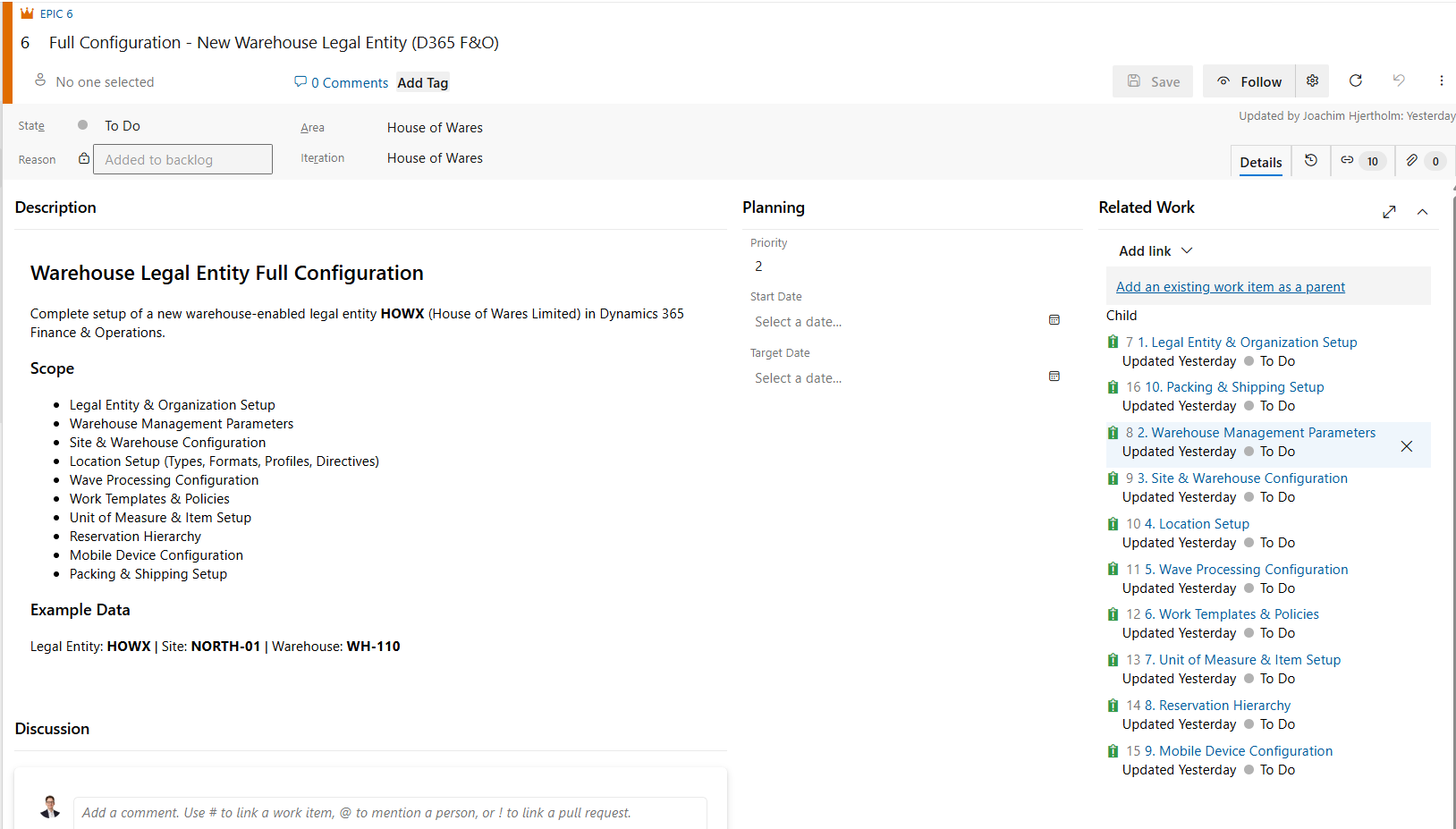 I�ve also generated an epic in my Azure DevOps Project, which contains a full setup of a legal entity with a focus on a Warehouse and logistics setup. Each track is an issue where there are specific tasks to carry out for each track.